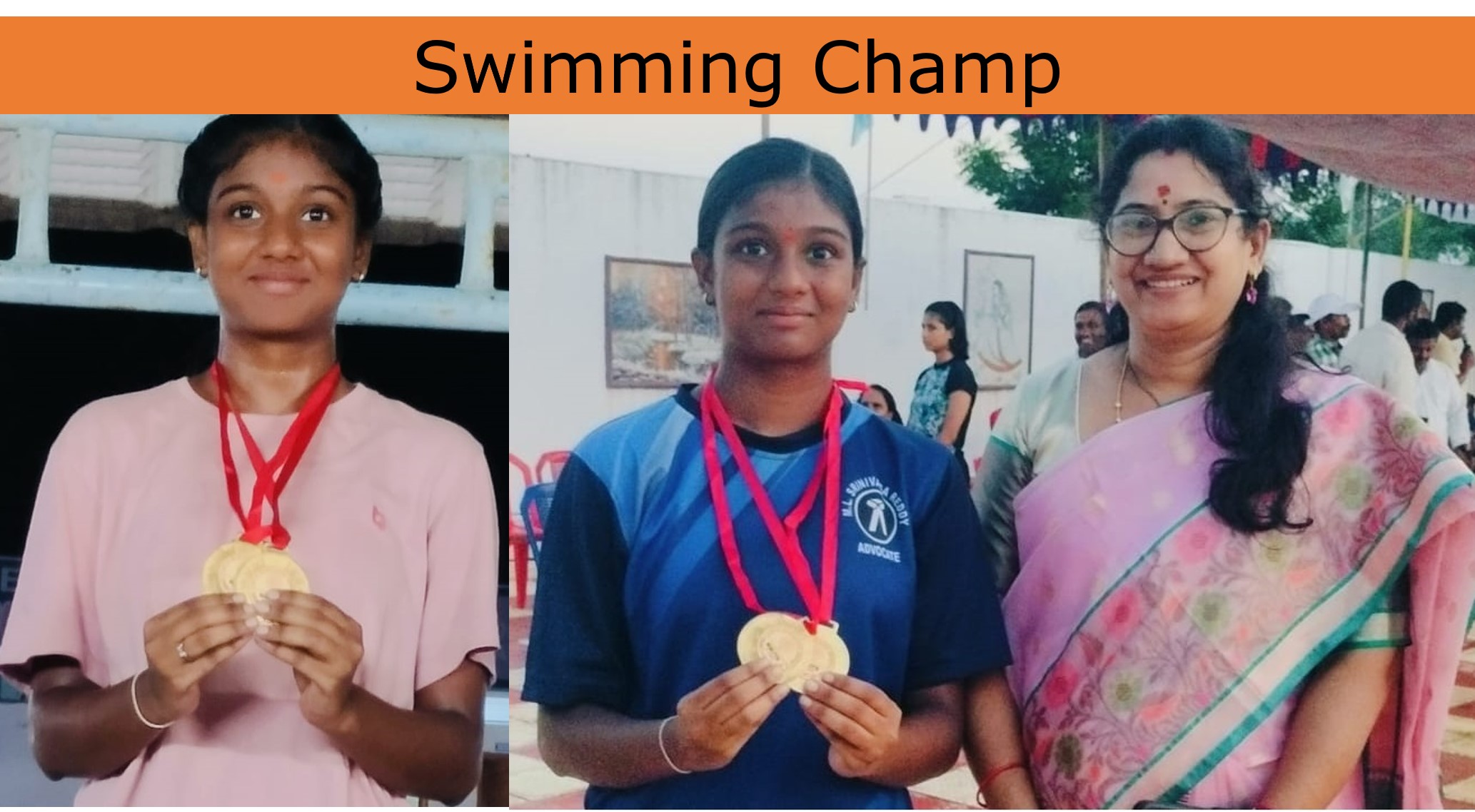మాంటిస్సోరియన్ కె.శృతి , పల్నాడు జిల్లా నరసరావుపేటలో నిర్వహించిన స్కూలు గేమ్స్ ఫెడరేషన్ ఆఫ్ ఇండియా రాష్ట్ర స్థాయి స్విమ్మింగ్ పోటీల్లో అండర్ 17 విభాగంలో 100 మీటర్స్ బట్టర్ ఫ్లై, 200 మీటర్స్ బ్యాక్ స్ట్రోక్ విభాగాల్లో ప్రథమ స్థానంలో నిలిచి గోల్డ్ మెడల్ సాధించి డిసెంబర్ 12వ తేదీ నుంచి డిల్లీలో నిర్వహించే జాతీయ స్థాయి పోటీలకు చిరంజీవి  కె.శృతి ఎంపికయ్యారు. జాతీయ స్థాయి పోటీలకు ఎంపికైన శృతిని, పల్నాడు జిల్లా విద్యాశాఖ అధికారి చంద్రకళ గారు అభినందిచారు.