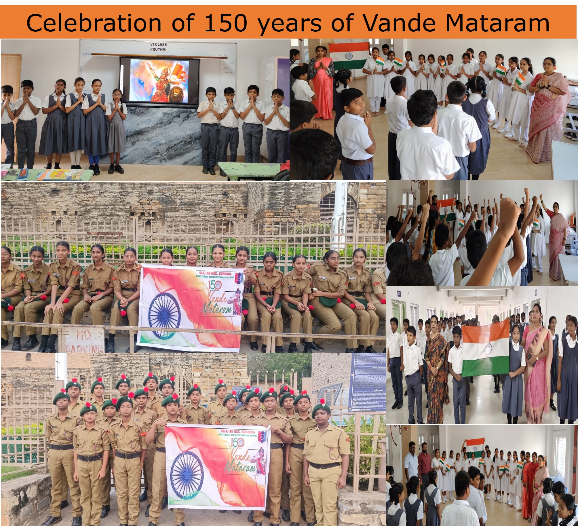 In the Montessori school, the 150th year of our National Song Vande Mataram was celebrated with great enthusiasm and patriotic spirit. The song, written by Bankim Chandra Chatterjee in 1876 in Bengali, became a source of inspiration during India’s freedom struggle and was officially recognized as the National Song of India in 1950. To mark this special occasion, students of NCC presented a soulful rendition of Vande Mataram that filled the atmosphere with devotion and pride. Teachers explained the meaning and importance of the song, reminding everyone of the sacrifices made by our freedom fighters and the deep love we must always hold for our Motherland.