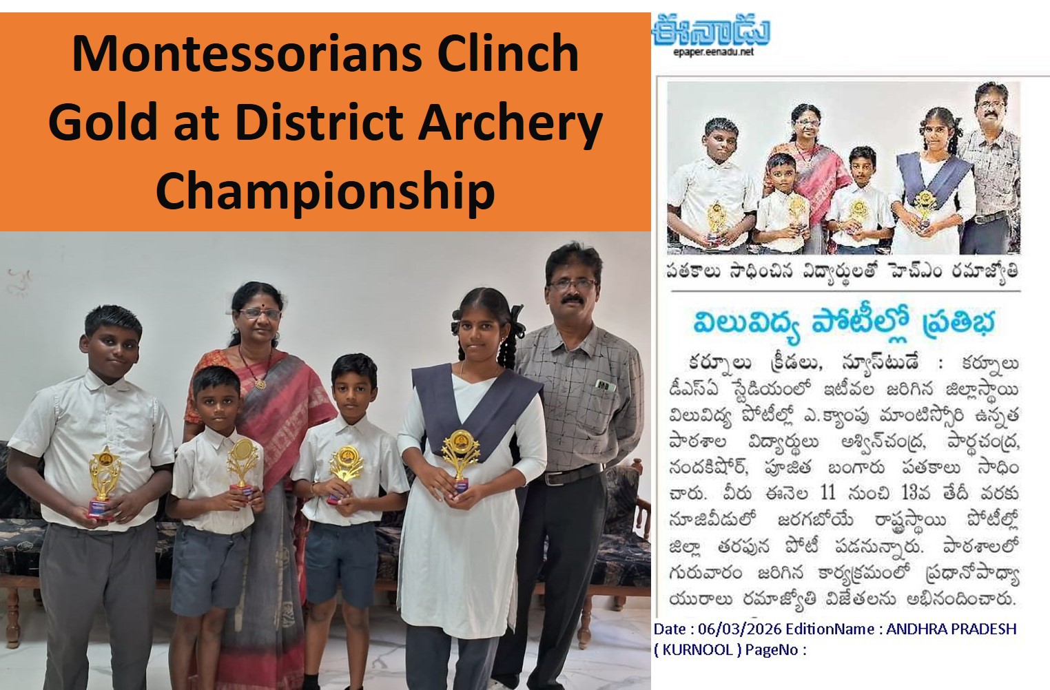 | Students from A-Camp Montessori High School in Kurnool demonstrated exceptional skill in the recently held District-Level Archery Competitions at the DSA Stadium. The following students won gold medals in their respective categories: Ashwin Chandra, Partha Chandra, Nandakishore, Poojitha.These winners will represent the Kurnool district in the upcoming State-Level Competitions scheduled to take place from the 11th to the 13th of this month in Nuzvid, Andhra Pradesh. During an event held at the school on Thursday, Headmistress Ramajyothi congratulated and honored the winners for their achievement. |