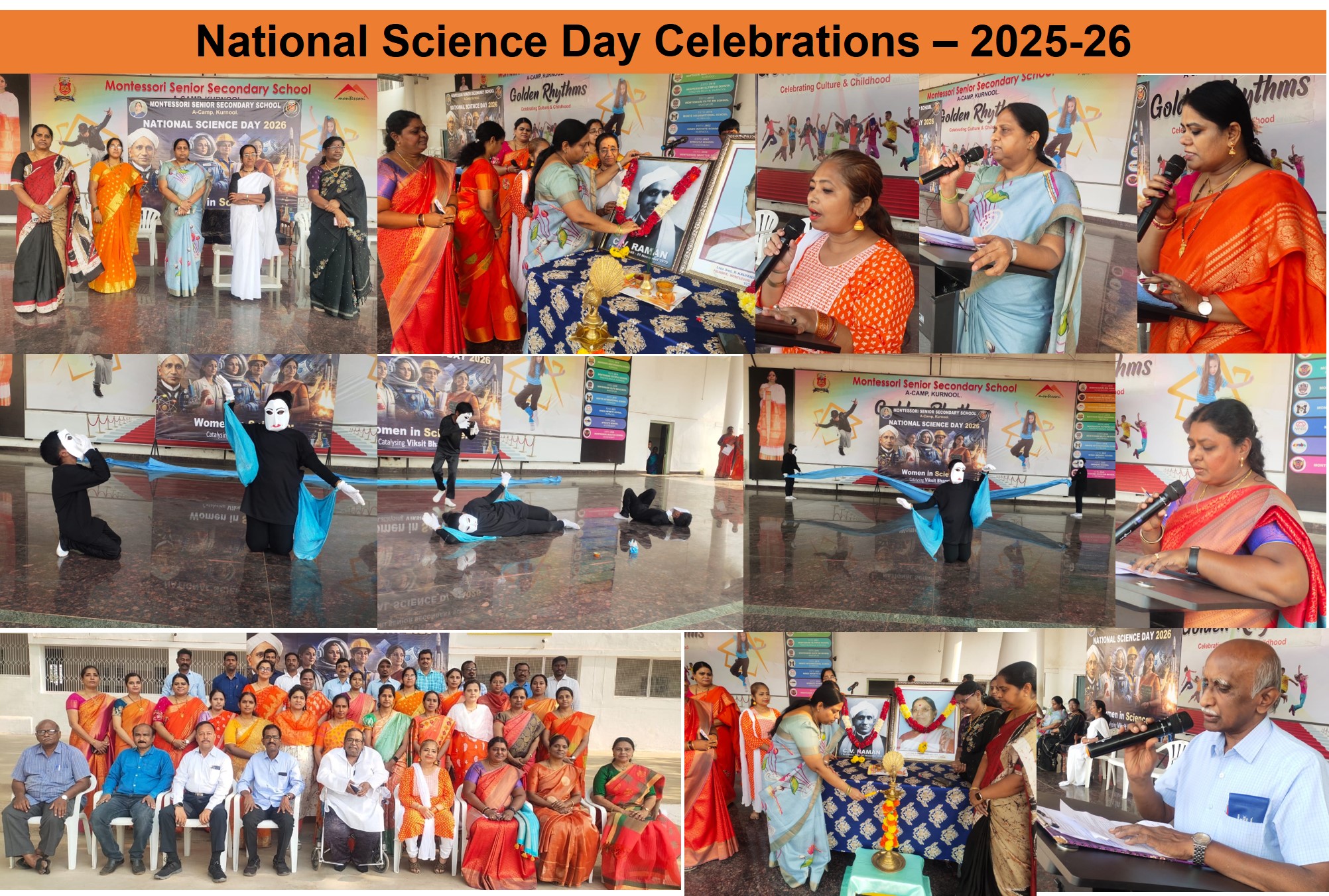 | At Montessori Sr. Secondary School, the National Science Day celebrations featured Dr. P. Radha Rani, a prominent MD Endocrinologist from Kurnool, as the Chief Guest. In her speech, she emphasized the importance of scientific thinking and the legacy of Sir C.V. Raman, who discovered the Raman Effect on February 28, 1928. The event included several student-led performances that combined environmental awareness with creative arts. Students performed a mime specifically focused on the hazards of garbage in water, highlighting the impact of waste on marine ecosystems. A choreographed dance was performed to celebrate scientific innovation and curiosity. In line with the theme of sustainability, students also showcased projects made from recycled materials, such as water filtration models and innovative “best out of waste” creations. |